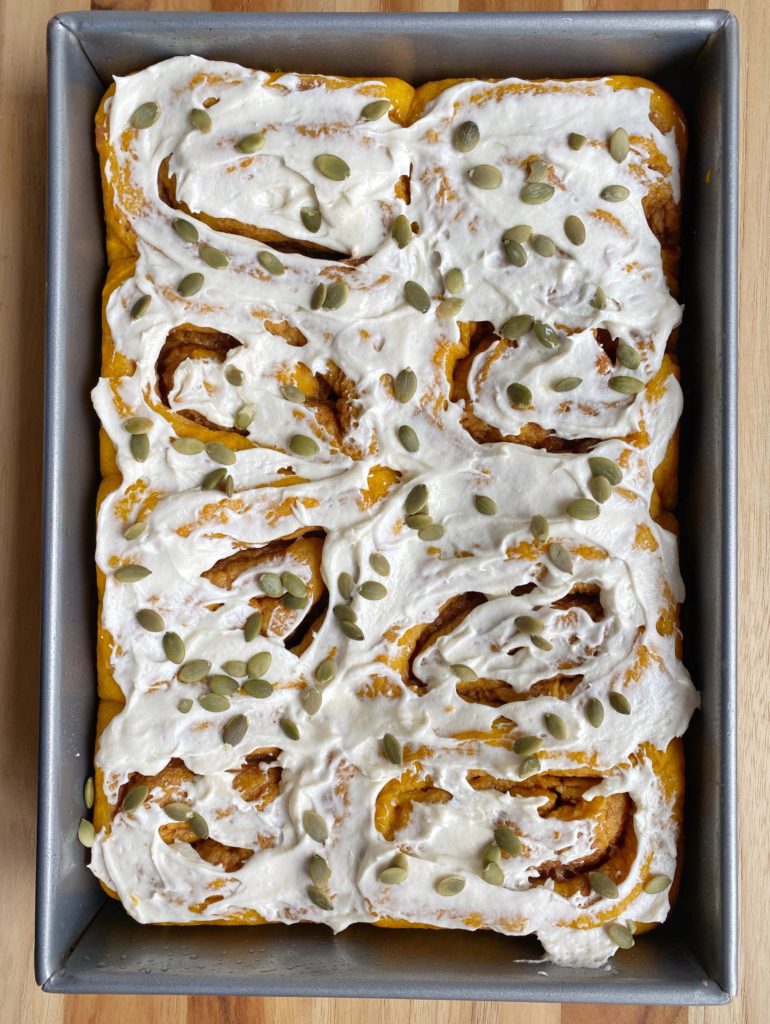I love the pumpkin flavor in these cinnamon rolls… it’s the perfect touch!