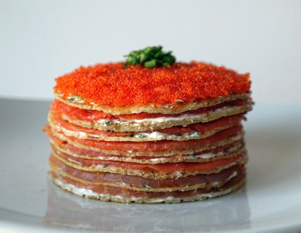 - Add a layer of the smoked salmon over the creme fraiche and then layer another crepe on top.