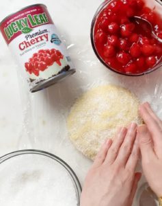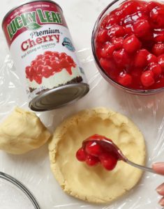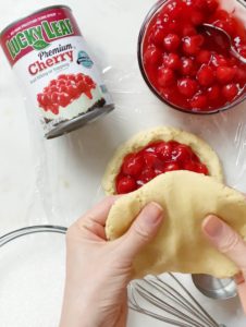 - Place 1/2 cup plus 1 tbsp of cherry filling in the center.